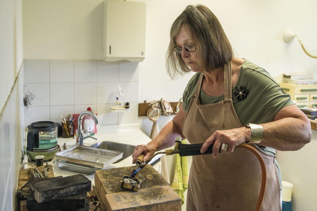 Het atelier is ruim en heel functioneel ingericht. Elke fase van het wordingsproces heeft hier een eigen plekje: een plek aan het raam om zilverdraad te trekken en te vormen, een plek waar gesoldeerd kan worden en plekken om van zilverplaat sieraden te zagen en smeden. In een vitrinekast staan haar studieopdrachten en sieraden die wachten op een eigenaar. “Hoe fijn is het om sieraden te gaan dragen en jezelf mooi te maken.” Ze deelt haar atelier geregeld met Ans Hoffmann.