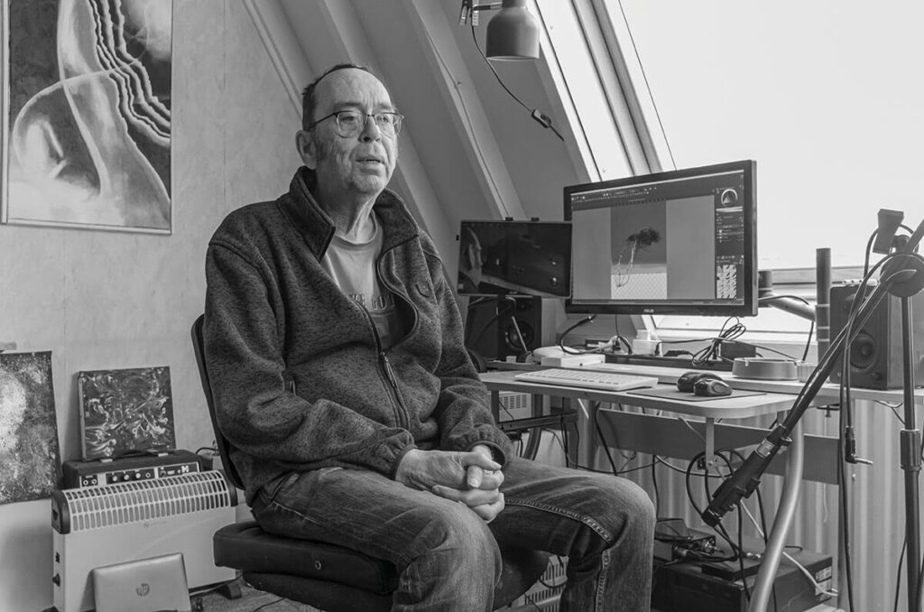 Op zijn bureau staan twee beeldschermen. Over zijn bril tuurt Arie naar de foto die hij aan het bewerken is. “Het zijn altijd foto’s die ik zelf heb gemaakt.” Arie laat zien hoe hij delen van de foto kan veranderen. Het schilderprogramma biedt uitgebreide keuzes. Van het uiteindelijke werk laat hij een canvasprint of een print op plexiglas maken. “Maar misschien beschilder ik de achtergrond daarna nog met olieverf.”
