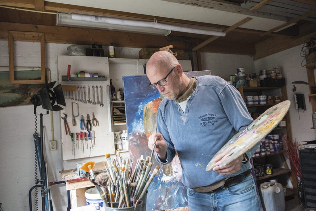 Met het palet op de linkerarm zoekt Freddy naar de juiste penseel. De muren van de werkplaats staan vol met gereedschap, verfblikken en tubes. De plafondverlichting is geen overbodige luxe. Bewerkt Freddy nu een foto, een tekening of een schilderij? “Ik ben al bijna 20 jaar decoratieschilder, kunstenaar èn fotograaf. Soms gebruik ik die vaardigheden apart, maar door combinaties uit te proberen ontstaan soms mooie dingen. Dat is kicken.”