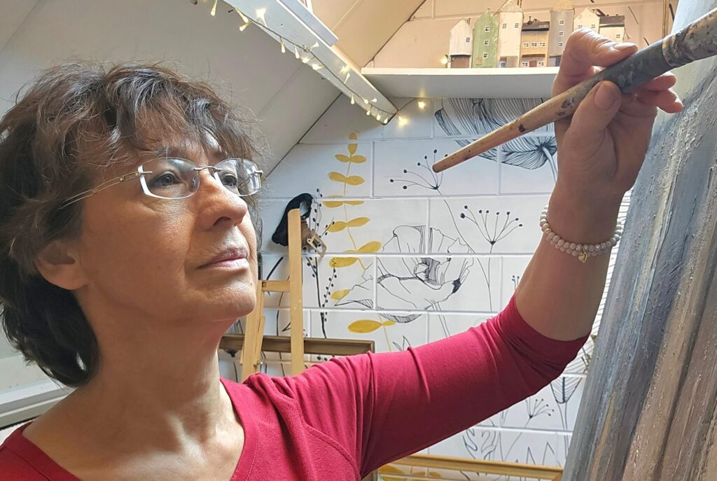 Het atelier ligt boven een dubbele garage en wordt verlicht met daglichtlampen. “Bij het schilderen maak ik vaak een beeld in mijn hoofd hoe de indeling op het doek moet worden.” Momenteel werkt ze aan de serie ‘Meditation’. “Ik mediteer graag en zie dan landschappen als een spiegel van mijn leven. Ik drijf dan mee in de rivier of beklim rotsen om mijn doel te bereiken.”