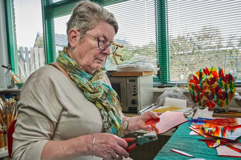 Het atelier bevindt zich in een ruime kamer met veel ramen die uitzien op een tuin vol met klaprozen. Langs de ramen staan tafels met glasplaten, glaspoeders en stukjes glas. Sinds anderhalf jaar staat er een grote oven op een verrijdbaar onderstel op tafelhoogte. “Het is plezierig dat ik heel hoog kan slumpen en groot werk kan maken.” Slumpen is het werkwoord dat verwijst naar het proces van glasbuigen.