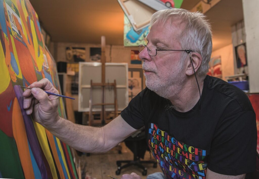 Het atelier op de Primulastraat is al een kunstwerk op zich. Johan werkt er graag met projectoren. Hij projecteert foto’s op het doek en maakt er vervolgens met acrylverf een goed gelijkende afbeelding van. “In 2018 heb ik de eerste prijs gewonnen bij een portretwedstrijd ‘de koning ingelijst’ van Oyfo in Hengelo.”