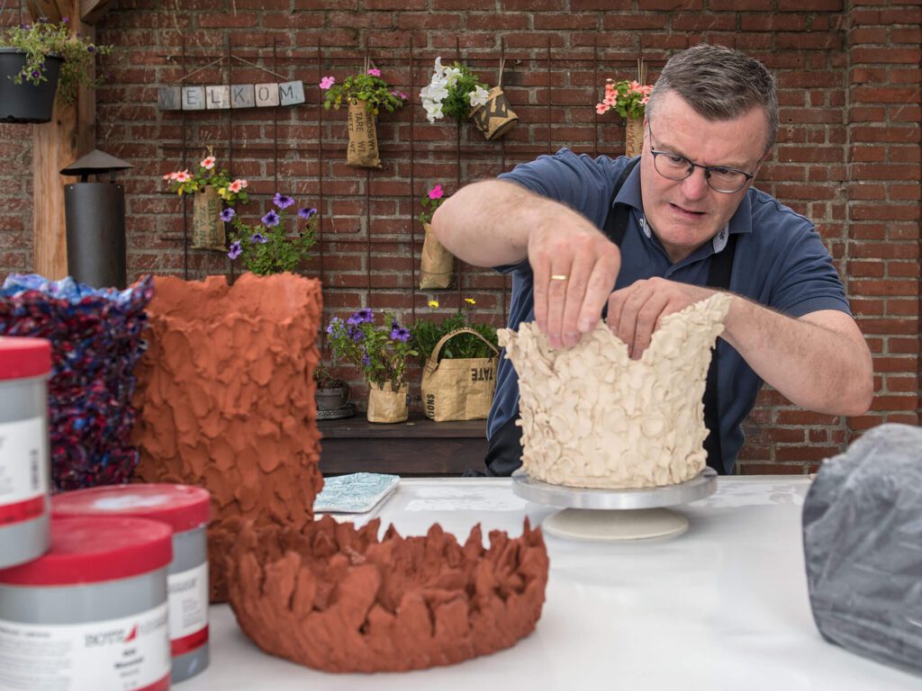 De basis voor zijn schilderwerk is bouwkit. Dit wordt vervolgens bijgesneden, geverfd en tenslotte afgewerkt met epoxy. “Heel veel ontstaat door toeval en eindeloos verschillende materialen uit te proberen.” Richard vindt ‘het Eerste Avondmaal’ één van zijn meest sprekende werken. Het verbeeldt het vieren met Christus in de Hemel. In andere werken is de boodschap subtieler verpakt: een raam of een weg naar de toekomst. Ook met keramiek experimenteert Richard volop. “Ik ben gefascineerd hoe ik het materiaal kan vormen en stoken.”
