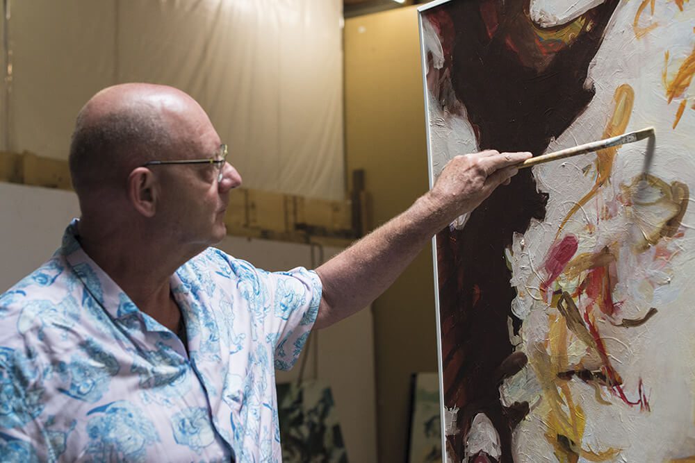 In het atelier staat Ruud voor een groot doek met een abstracte afbeelding. Met zijn linkerarm lijkt hij met zijn penseel een detail op het doek aan te wijzen. “Ik haal mijn inspiratie vaak uit nieuwsfoto’s. Ik maak er dan een abstract schilderij van zonder het nieuws over te nemen.” Momenteel zijn dat bijvoorbeeld foto’s uit Oekraïne. Ruud voelt zich onder meer geïnspireerd door Willem de Kooning. Hij deelt het atelier met Marianne van den Eynde.