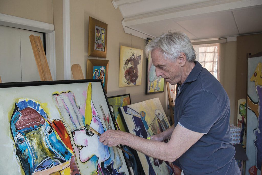 In zijn atelier op zolder valt het zonlicht op het doek. De hele ruimte staat vol met zijn werk. Theo strijkt met zijn penseel wat groene verf op of net achter zijn fabelfiguur. “Dat vlakje zit daar voor de diepte. Je mag zelf bepalen wat je ziet.” Het werk is in Cobra stijl, vervaardigd met inkt en acryl. “Ik werk zonder voorbeelden gewoon wat in me opkomt.