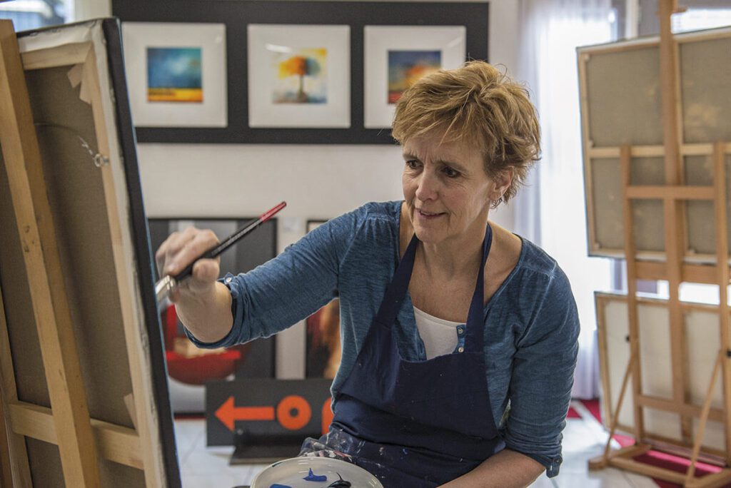 Ik hang in heel Twente.” Winny schildert meestal in haar atelier aan huis. De huidige stijl van Winny Lenderink is te omschrijven als impressionistisch. Met het schilderen van koks en recepten kreeg ze bekendheid. Het meer recente werk omvat vooral olieverfschilderijen met steden, veldbloemen, straattaferelen en portretten. “Voor de Hartstichting mocht ik laatst een Waakkast beschilderen. Ook vind ik het leuk om een ziekenhuisgang of een vergaderruimte op te vrolijken met mijn werk. Ik ben van de verbinding, met alles.” Die verbinding voelt ze ook met bezoekers. “Dit atelier heeft ook een sociale functie.” Winny Lenderink wilde ooit tekenleraar worden. Het werd de schildersacademie in Ootmarsum.