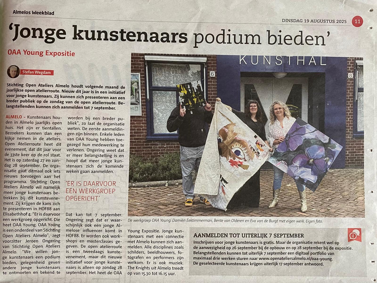 Het Almelo’s Weekblad schreef in augustus 2025 over ons nieuwe initiatief OAA Young, waarmee we jonge kunstenaars een speciaal podium bieden tijdens de Atelierroute in HOF88.